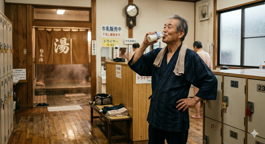The post-bath milk is not a marketing gimmick. It is not nostalgia for its own sake. It is one of the most physically perfect food pairings that exists: your body temperature is elevated, you’ve lost fluids, and the cold, protein-rich milk slides down with a satisfaction that is genuinely difficult to describe in polite language. The classic is plain cold milk — sento gyunyu (銭湯牛乳) — often in a small glass bottle.